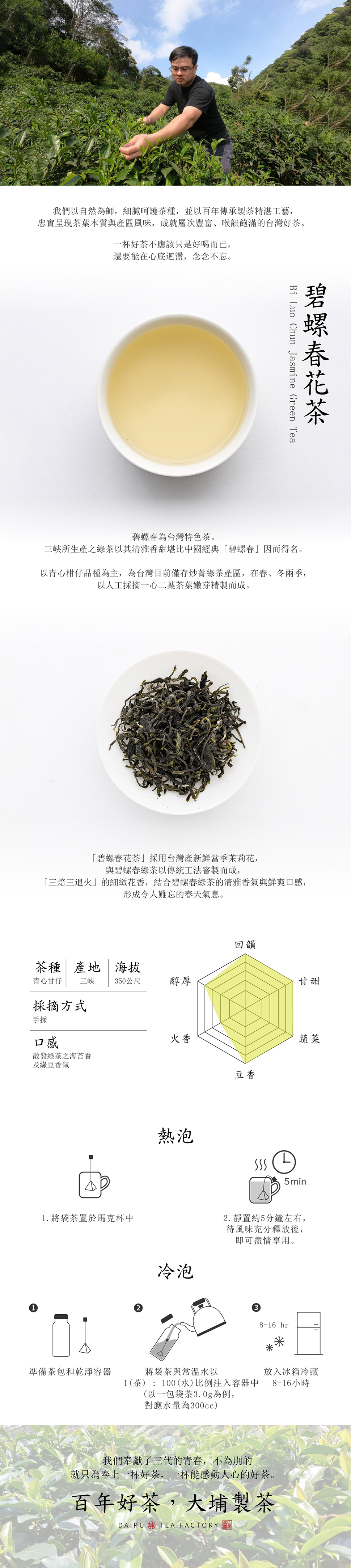 【原葉袋茶】碧螺春茉莉花茶 「碧螺春花茶」採用台灣產新鮮當季茉莉花,與碧螺春綠茶以傳統工法窨製而成,「三焙三退火」的細緻花香,結合碧螺春綠茶的清雅香氣與鮮爽口感,形成令人難忘的春天氣息。規格 ◆100% 台灣手採茶 ◆碧螺春茉莉花茶包 8包入 ◆賞味期限: 二年(開封後請儘早享用) 售價 $250 活動價 $200 數量 - + 加入購物車 立即結帳 分享到 分享 產品介紹 回上一頁