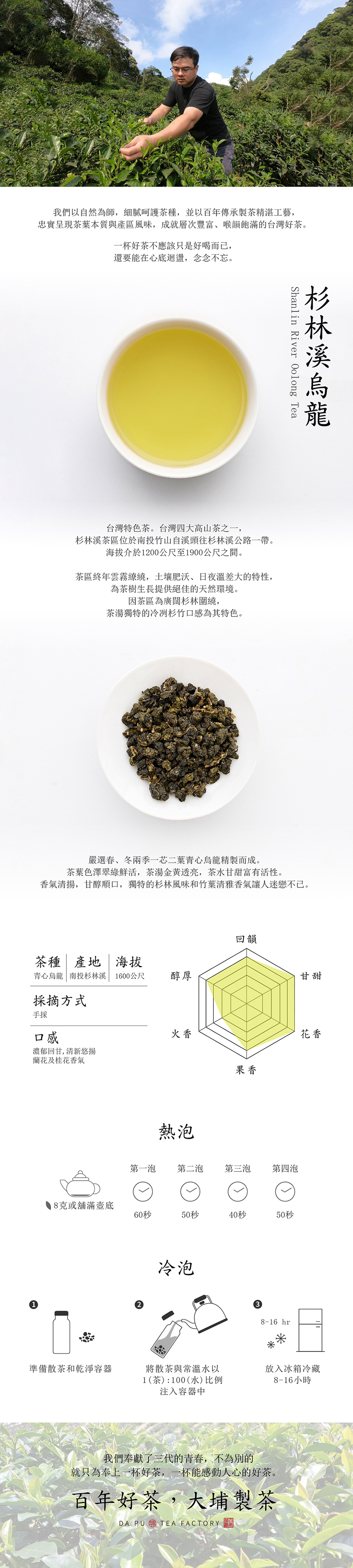 杉林溪烏龍 台灣特色茶。台灣四大高山茶之一,杉林溪茶區位於南投竹山自溪頭往杉林溪公路一帶。海拔介於1200公尺至1900公尺之間。茶區終年雲霧繚繞,土壤肥沃、日夜溫差大的特性為茶樹生長提供絕佳的天然環境。因茶區為廣闊杉林圍繞,茶湯獨特的冷冽杉竹口感為其特色。 嚴選春、冬兩季一芯二葉青心烏龍精製而成。茶葉色澤翠綠鮮活,茶湯金黃透亮,茶水甘甜富有活性。香氣清揚,甘醇順口,獨特的杉林風味和竹葉清雅香氣讓人迷戀不已。 規格 ◆100% 台灣手採茶 ◆杉林溪烏龍茶 二盎司 ◆賞味期限:二年(開封後請儘早享用) 售價 $560 活動價 $520 數量 - + 加入購物車 立即結帳 分享到 分享 產品介紹 回上一頁