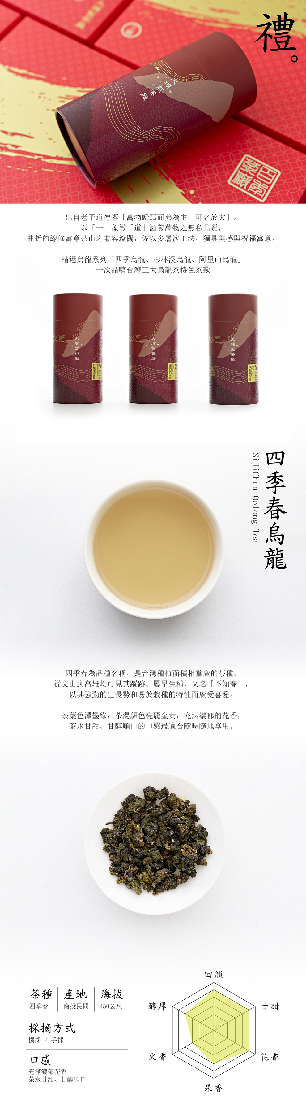 特選烏龍【四季烏龍、杉林溪烏龍、阿里山烏龍】 【特選好茶】特選烏龍系列 一次品嚐台灣三大烏龍茶特色茶款 出自老子道德經「萬物歸焉而弗為主,可名於大」。 以「一」象徵「道」涵養萬物之無私品質,曲折的線條寓意茶山之兼容遼闊,佐以多層次工法,獨具美感與祝福寓意。規格 ◆100% 台灣手採茶 ◆杉林溪烏龍茶 二 盎司、四季春烏龍茶 二 盎司 、阿里山烏龍茶 二 盎司 ◆禮盒尺寸:長 340 x 寬 230 x 高 90 mm ◆賞味期限:二年(開封後請儘早享用) ◆附送禮提袋 售價 $1550 活動價 $1550 數量 - + 加入購物車 立即結帳 分享到 分享 產品介紹 回上一頁
