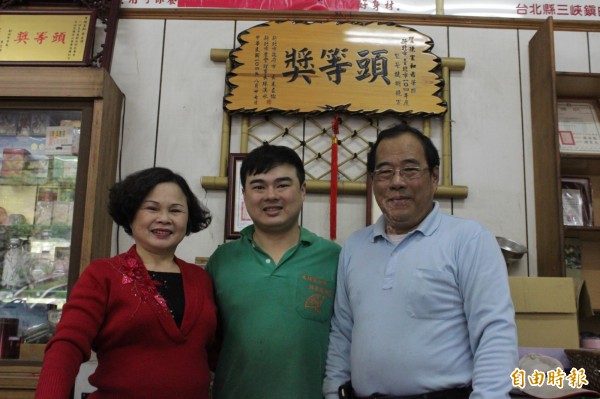 第三代老闆陳宣和(中)接棒後,在民國104年代表三峽獲得雙北市製茶技術競賽頭等獎。(記者邱書昱攝)